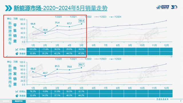 6月11日,中國汽車工業(yè)協(xié)會乘用車市場聯(lián)席分會(以下簡稱‘乘聯(lián)會’)發(fā)布數(shù)據(jù),新能源車市場零售80.4萬輛,同比增長38.5%,環(huán)比增長18.7%,這在整體乘用車5月銷量同比下降1.9%的對比下,顯得格外難能可貴。