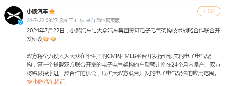 今年以來,小鵬汽車與大眾汽車集團(tuán)已簽署三個(gè)協(xié)議。除上述兩個(gè)電子電氣架構(gòu)相關(guān)協(xié)議外,今年2月29日,小鵬汽車與大眾集團(tuán)宣布,簽訂平臺與軟件聯(lián)合開發(fā)協(xié)議,加速兩款B級純電動汽車的聯(lián)合研發(fā),將于2026年上市,面向中國市場,首款車型為SUV。