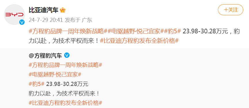 據(jù)悉,方程豹是比亞迪旗下面向中高端市場(chǎng)的專業(yè)個(gè)性化品牌。2023年8月16日,方程豹品牌正式發(fā)布。