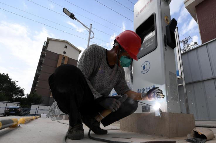 8月15日,在湖畔嘉苑麗景苑東北角停車場(chǎng)新能源汽車充電樁城市基礎(chǔ)配套設(shè)施停車場(chǎng),施工人員正對(duì)45個(gè)充電樁進(jìn)行最后的安裝調(diào)試。