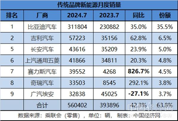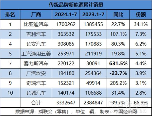 從前7個(gè)月的累計(jì)銷量來看,傳統(tǒng)新能源車企還是維持原有格局,入圍前十榜單的8家品牌的合計(jì)銷量超過333萬輛,同比增長(zhǎng)39.7%,在新能源乘用車總銷量中的占比近七成。
