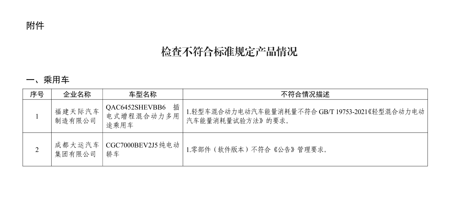 (一)新能源乘用車(chē),共涉及2家企業(yè)的2個(gè)車(chē)型產(chǎn)品,涉及電動(dòng)汽車(chē)能量消耗量生產(chǎn)一致性不符合標(biāo)準(zhǔn)要求、零部件(軟件版本)不符合《公告》管理要求。