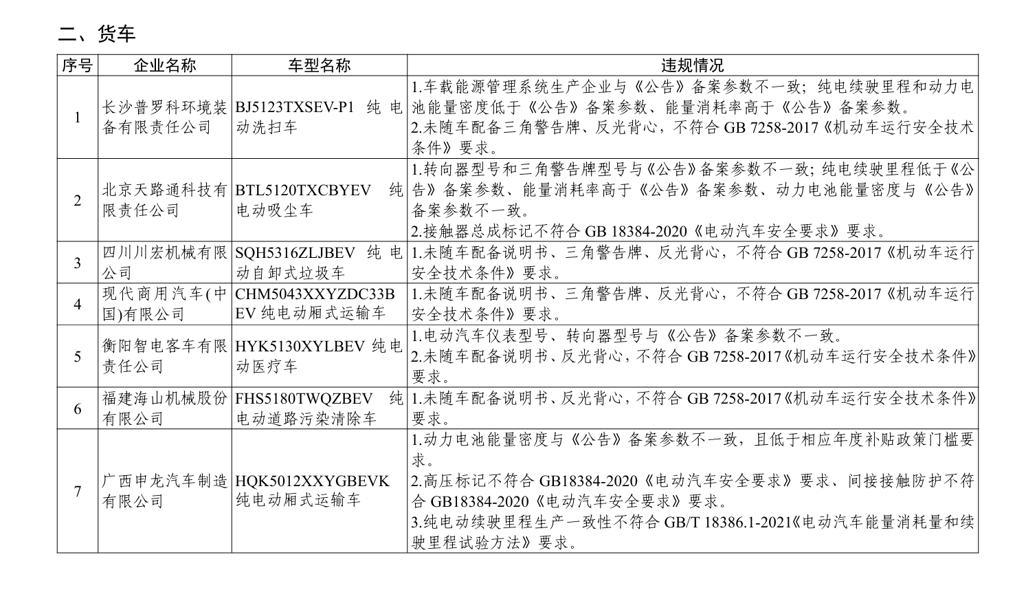 (二)新能源貨車(chē),共涉及7家企業(yè)的7個(gè)車(chē)型產(chǎn)品,涉及零部件參數(shù)與《公告》備案參數(shù)不一致、高壓標(biāo)記不符合標(biāo)準(zhǔn)要求等問(wèn)題。