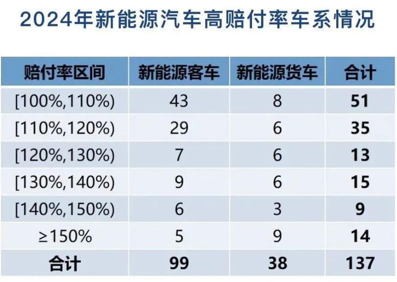 承保的2795個車系中,賠付率超過100%(即虧損)的高賠付率車系有137個。其中,新能源客車共承保車系1654個,承保2982萬輛;承保車輛數超過1萬輛的車系301個,其中賠付率超過100%的車系有99個。新能源貨車共承保車系1141個,承保123萬輛;承保車輛數超過0.5萬輛的車系55個,其中賠付率超過100%的車系有38個。