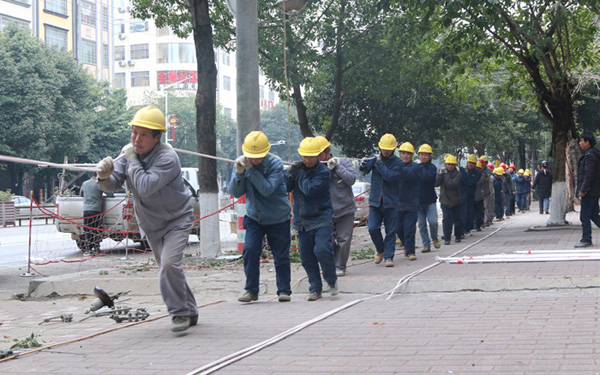日前,在湖南省永州市寧遠縣城區(qū)舜帝北路段,筆者看到,電力工人們正在忙碌地架設(shè)10KV 逍水線延伸線。