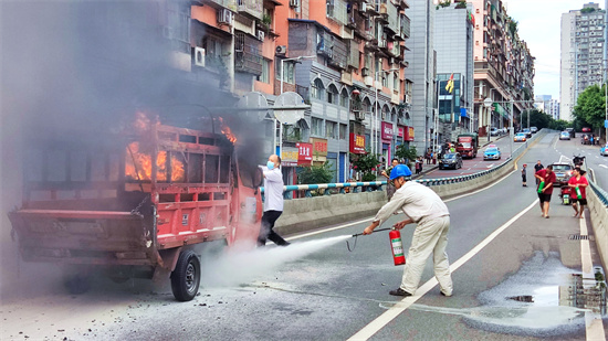“注意安全,大家不要靠近起火點(diǎn)!”眼看火勢(shì)越來(lái)越大,恐燃燒引發(fā)爆炸危及路人和過(guò)往車輛,趕到現(xiàn)場(chǎng)后,熊波和郝俊偉提醒并疏導(dǎo)路人遠(yuǎn)離。張航則拿起滅火器,趕到起火三輪車上風(fēng)方向,拔掉保險(xiǎn)銷,一手握住壓把一手握住噴管,對(duì)準(zhǔn)火苗根部進(jìn)行直噴滅火。