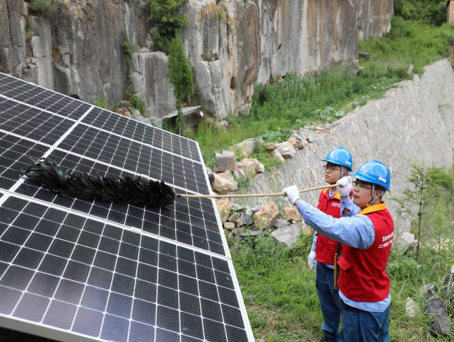 國(guó)網(wǎng)晉城供電公司員工在陵川縣嶺西村檢查光儲(chǔ)一體公用型微電網(wǎng)