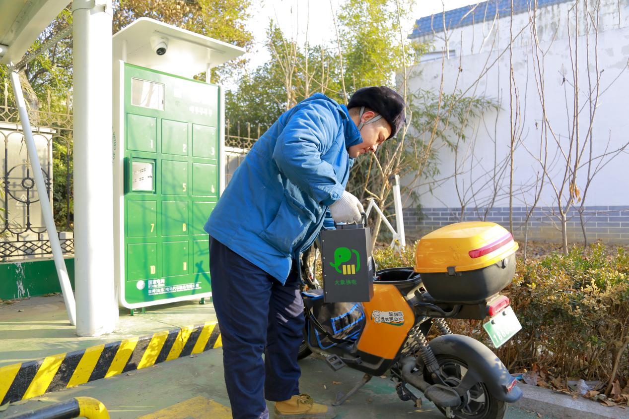 國網(wǎng)棗莊供電公司常莊供電所員工為現(xiàn)場檢修騎乘的“大象換電”自行車更換電池。(賈方寧 攝)