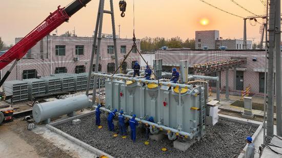 國網(wǎng)石家莊供電公司工作人員對220千伏安托變電站主變進行更換作業(yè)。胡國秋攝