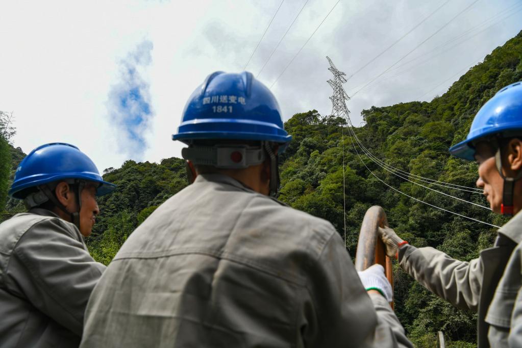 10月18日,在四川省雅安市天全縣喇叭河鎮(zhèn),技術(shù)人員在操作駐架車回卷三級(jí)導(dǎo)引繩。新華社記者 王曦 攝