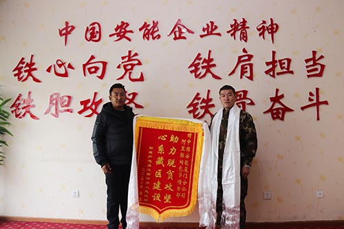 3月底,薩嘎縣達(dá)吉嶺鄉(xiāng)派出所營區(qū)計(jì)劃進(jìn)行整體硬化,但由于當(dāng)?shù)亟ㄔO(shè)經(jīng)費(fèi)緊張,一直未能批復(fù)。何樂鋒在了解當(dāng)?shù)氐睦щy后,主動(dòng)為他們捐贈(zèng)了20噸水泥,解決了他們建設(shè)的燃眉之急,有效改善了派出所的辦公生活條件。嶺鄉(xiāng)派出所所長(zhǎng)旦增扎巴專程來到項(xiàng)目部,為全體人員獻(xiàn)上潔白的哈達(dá),為項(xiàng)目部贈(zèng)送了印有“心系藏區(qū)建設(shè),助力脫貧攻堅(jiān)”內(nèi)容的錦旗和感謝信,“中國安能為我們幫了大忙,建設(shè)阿里聯(lián)網(wǎng)工程為我們送電,為我們解決務(wù)工難題,還支持我們建設(shè),我受我們鄉(xiāng)書記委托,專程過來感謝你們,我們達(dá)吉嶺鄉(xiāng)全鄉(xiāng)人民都感謝你們!”他緊握項(xiàng)目經(jīng)理何樂峰的雙手,動(dòng)情地說道。
