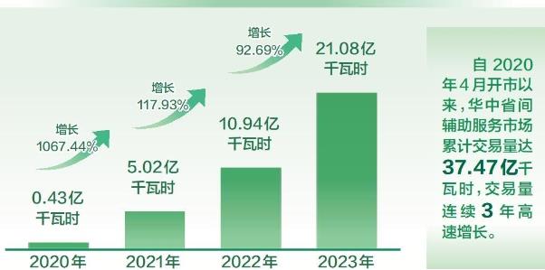 華中省間電力輔助服務(wù)市場交易量(省間調(diào)峰輔助服務(wù)交易量+省間備用輔助服務(wù)交易量)連續(xù)3年高速增長。2020年、2021年、2022年、2023年交易量分別為0.43億、5.02億、10.94億、21.08億千瓦時,2021、2022、2023年交易量分別同比增長1067.44%、117.93%、92.69%。自2020年4月開市以來,市場累計交易量達(dá)37.47億千瓦時。