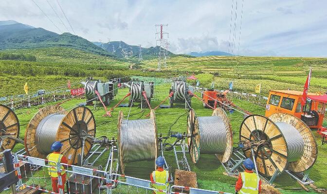 日月山—杜鵑雙回線路工程導線展放作業(yè)現(xiàn)場。鄒建華 攝