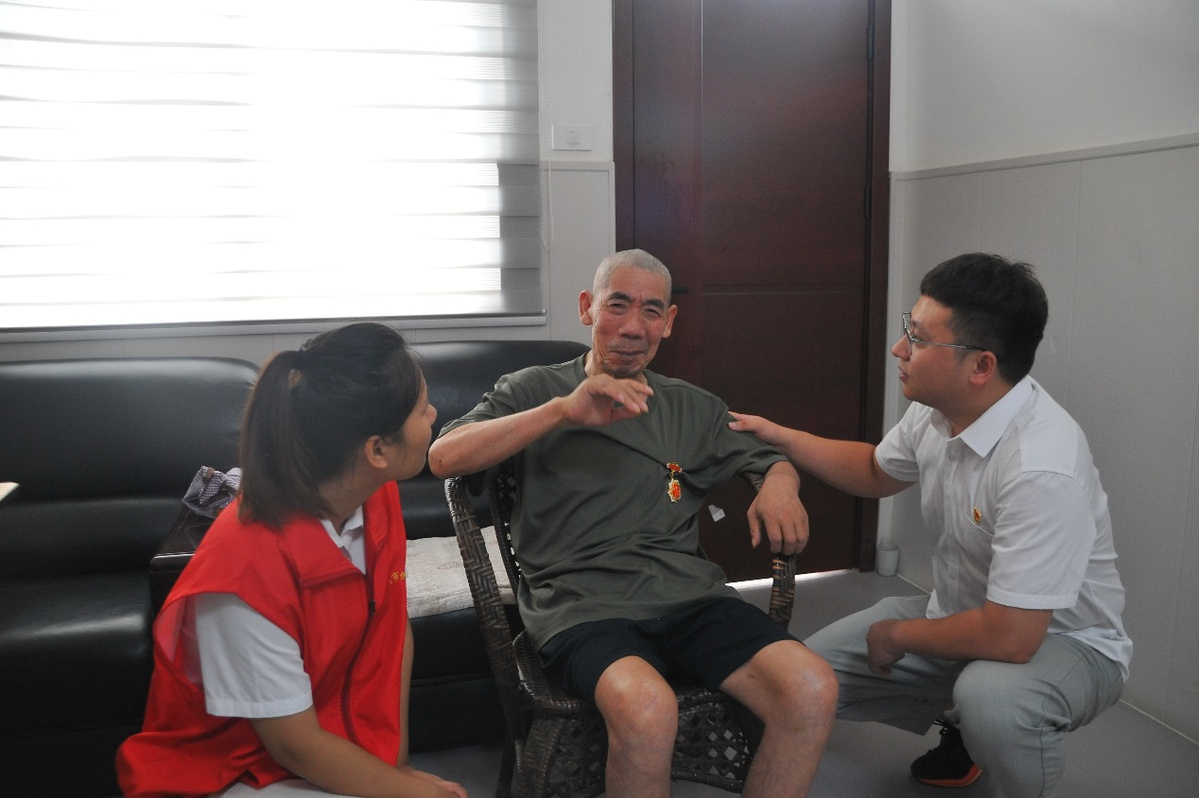 活動中,在看望98歲高齡的抗戰(zhàn)老兵李位發(fā)和60歲老人宋洪彥時,志愿者給老人送上了精心準備的慰問品,和老人促膝交談,對其為國家所作出的貢獻表示感謝。老人向大家講述自己參加抗美援朝戰(zhàn)爭和中越邊境自衛(wèi)反擊戰(zhàn)時的經(jīng)歷。志愿者還詳細詢問了老人的身體健康情況,并叮囑老人要保重身體,祝愿老人健康長壽。