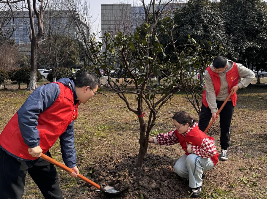 隨后,三方黨支部號召黨員、團員共同踐行“綠水青山就是金山銀山”理念,開展“共植黨員林”植樹活動。身穿紅色馬甲的黨員、團員們彼此團結協(xié)作、緊密配合,有條不紊的進行著揮楸鏟土、扶苗填坑、提桶澆水等各環(huán)節(jié)作業(yè)。經(jīng)過大家的共同努力,三個黨支部一起種下的“共建樹”在土地上挺立著,“黨建紅”與“生態(tài)綠”交相輝映,呈現(xiàn)出春意盎然、生機勃勃的景象。