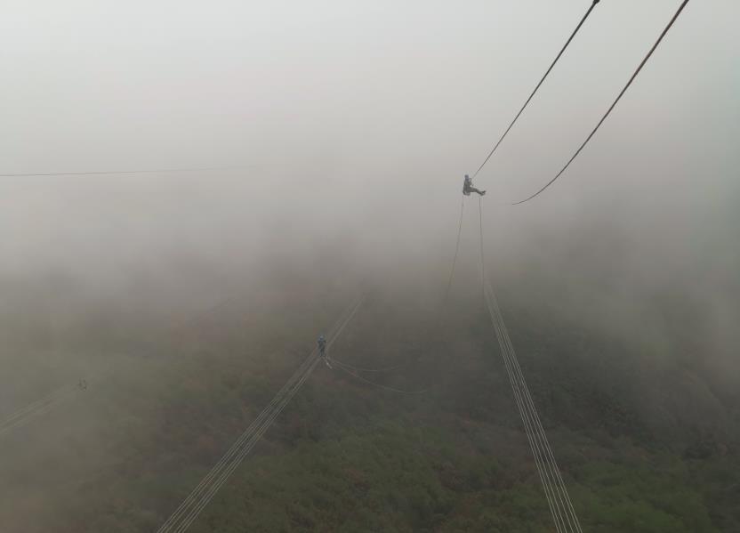 寒潮前夕,南方電網(wǎng)超高壓公司柳州局輸電所檢修人員頂著寒風(fēng)在架空地線上懸空開展500千伏桂山乙線55#大號(hào)側(cè)架空地線復(fù)合光纜補(bǔ)強(qiáng)工作,確保在即將到來的雨雪冰凍天氣中覆冰監(jiān)測裝置及整條線路保持安全運(yùn)行。