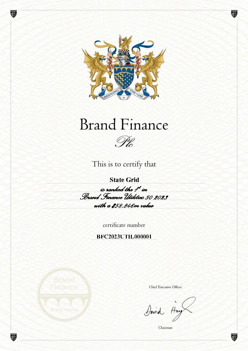 ▲2023年全球公用事業(yè)50強品牌榜首證書