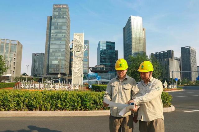 國網(wǎng)北京亦莊供電公司員工在北京經(jīng)開區(qū)中關(guān)村國家自主創(chuàng)新示范區(qū)巡檢重點線路,保障高溫天氣下電網(wǎng)運行平穩(wěn)。