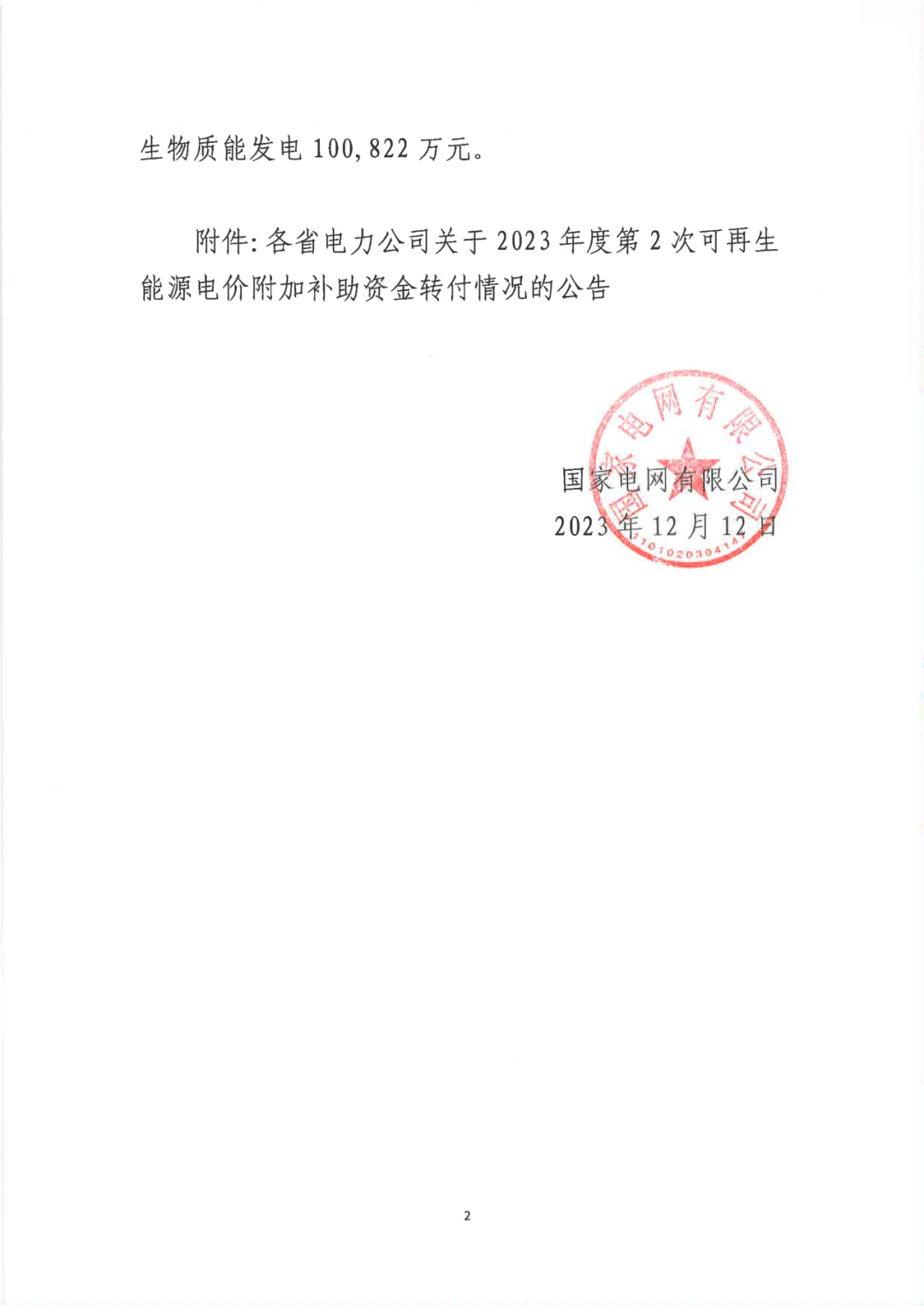 原文如下:按照《財(cái)政部 國(guó)家發(fā)展改革委 國(guó)家能源局關(guān)于印發(fā)<可再生能源電價(jià)附加資金管理辦法>的通知》(財(cái)建〔2020〕5號(hào))文件要求,國(guó)家電網(wǎng)有限公司(以下簡(jiǎn)稱“公司”)將2023年第2次可再生能源電價(jià)附加補(bǔ)助資金的撥付原則和順序等相關(guān)情況公告如下:一、補(bǔ)助資金撥付原則和順序公司嚴(yán)格按照財(cái)政部《關(guān)于調(diào)劑2023年可再生能源電價(jià)附加補(bǔ)助資金預(yù)算的通知》(財(cái)資〔2023〕93號(hào))中明確的補(bǔ)貼資金撥付原則和順序,在收到財(cái)政部撥付款項(xiàng)后,對(duì)納入補(bǔ)貼目錄或清單且滿足結(jié)算條件的各類項(xiàng)目進(jìn)行及時(shí)、足額轉(zhuǎn)付。具體情況見(jiàn)各省電力公司公告。二、2023年第2次補(bǔ)助資金情況2023年11月,財(cái)政部下達(dá)公司可再生能源電價(jià)附加補(bǔ)助資金年度預(yù)算2,550,000萬(wàn)元,其中:風(fēng)力發(fā)電1,224,013萬(wàn)元,太陽(yáng)能發(fā)電1,225,165萬(wàn)元,生物質(zhì)能發(fā)電100,822萬(wàn)元。