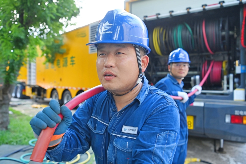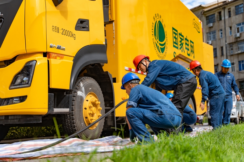 國(guó)網(wǎng)陜西寶雞供電公司員工為受汛情影響小區(qū)接通發(fā)電車。