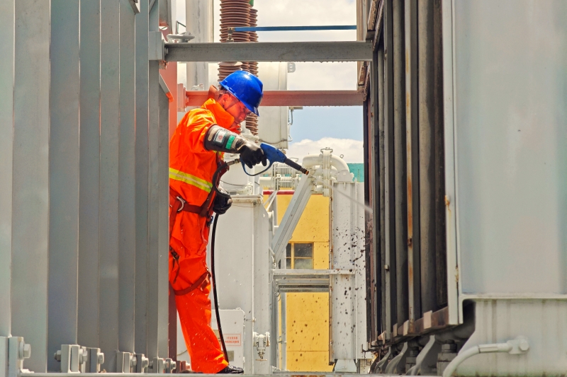 國(guó)網(wǎng)山西陽泉供電公司員工帶電水沖洗220千伏溫池變電站1號(hào)主變散熱器。