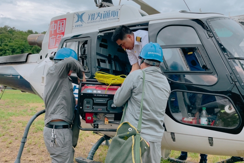 國網(wǎng)湖南郴州供電公司員工利用直升機搬運發(fā)電機。
