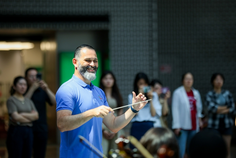為了展現(xiàn)巴西本土音樂藝術(shù)特色,樂團(tuán)先演奏了當(dāng)?shù)孛栋臀鳀|北部音樂集錦》和《水漾巴西》,熱烈奔放的桑巴曲風(fēng)吸引了許多觀眾隨著音樂舞動。