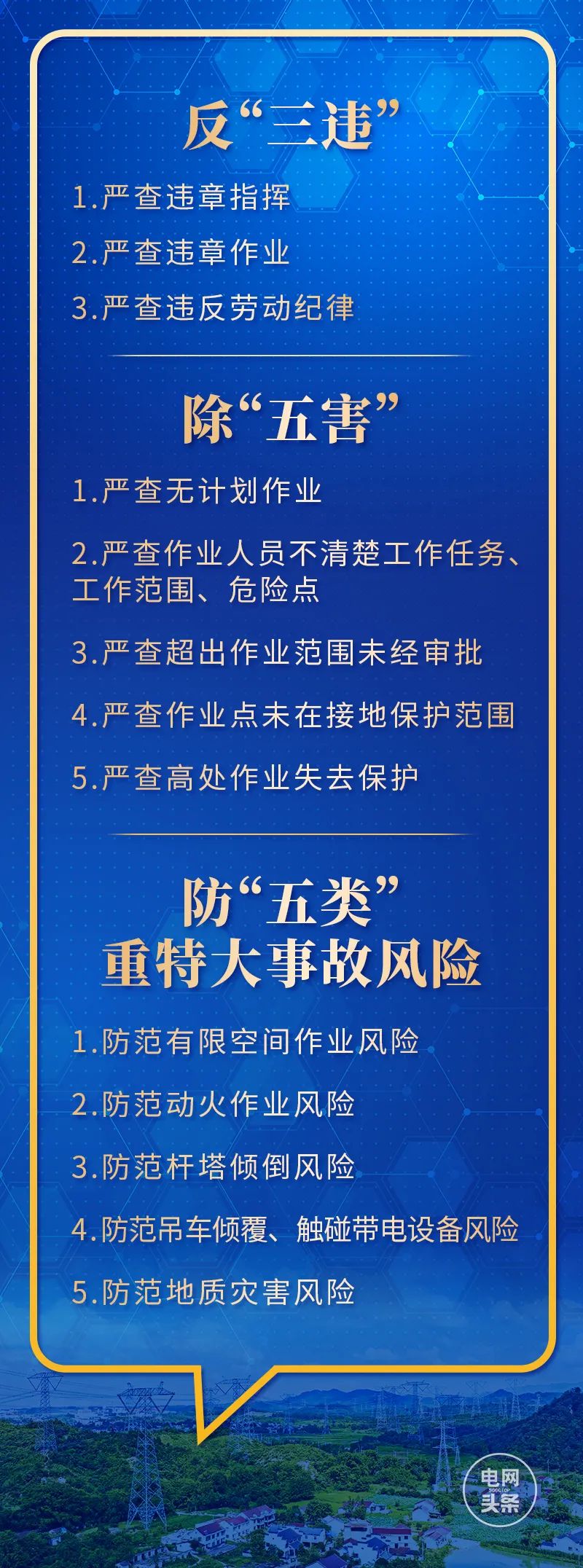 當(dāng)前,國家電網(wǎng)公司秋季檢修預(yù)試和電網(wǎng)建設(shè)工作即將進(jìn)入高峰期。為認(rèn)真貫徹公司2024年安全生產(chǎn)工作意見,落實(shí)公司《關(guān)于開展電力安全生產(chǎn)反“三違”專項(xiàng)行動(dòng)的通知》要求,嚴(yán)格秋季作業(yè)安全管控,守牢人身安全紅線,國家電網(wǎng)公司自9月至12月開展秋季作業(yè)“反三違、除五害”活動(dòng)。