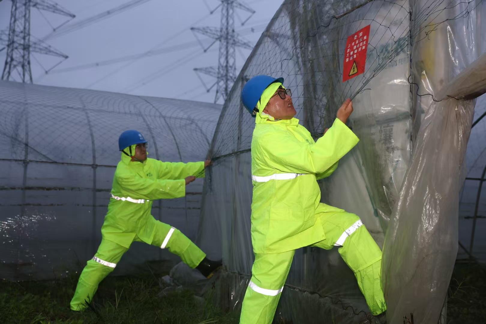 國網(wǎng)上海超高壓公司輸電運(yùn)維人員在浦東臨港地區(qū)緊急處置輸電通道下破損蔬菜大棚