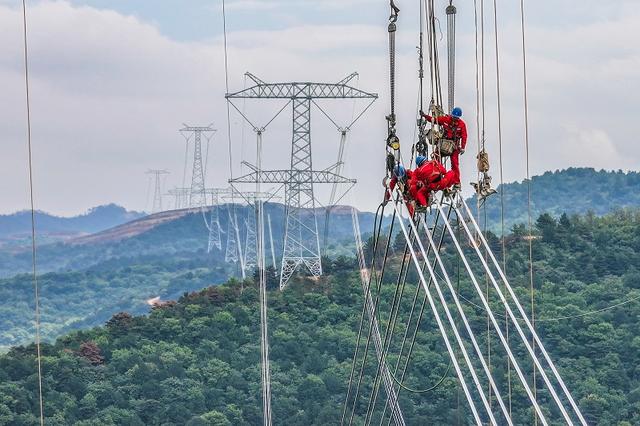國(guó)網(wǎng)上海送變電工程有限公司施工人員在哈密—重慶±800千伏特高壓直流輸電線路工程開(kāi)展緊掛線作業(yè)。