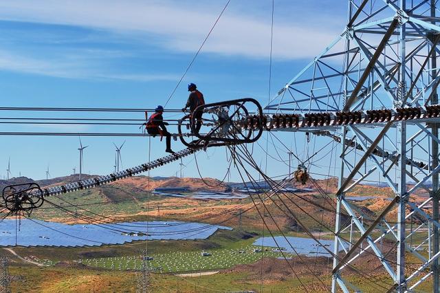 國(guó)網(wǎng)甘肅電力施工人員在哈密—重慶±800千伏特高壓直流輸電工程開(kāi)展架線自檢。