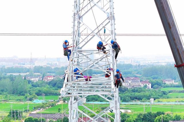 國(guó)網(wǎng)江蘇揚(yáng)州供電公司施工人員在220千伏鳳蜀線路工程立塔作業(yè)。