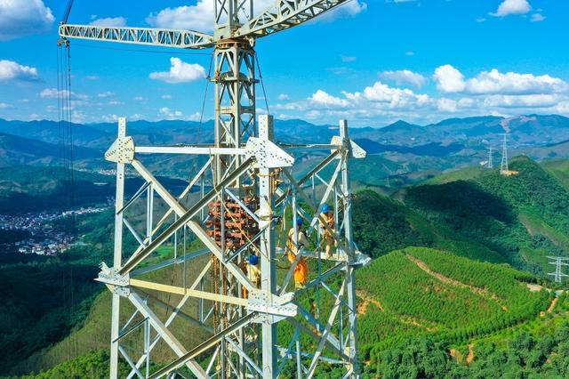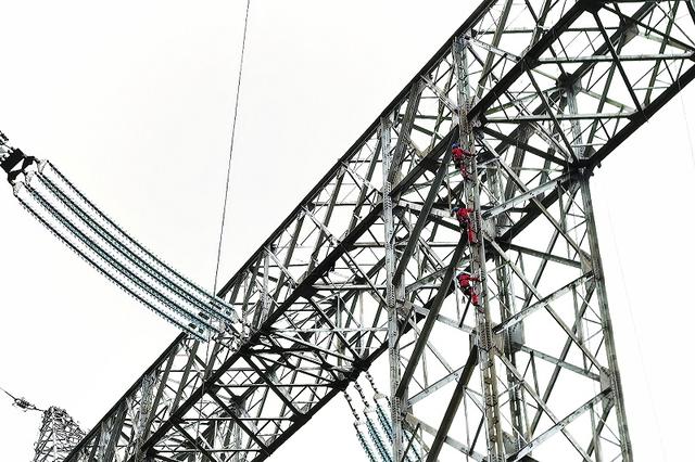 國(guó)網(wǎng)四川電力施工人員在川渝1000千伏特高壓交流工程登塔作業(yè)。