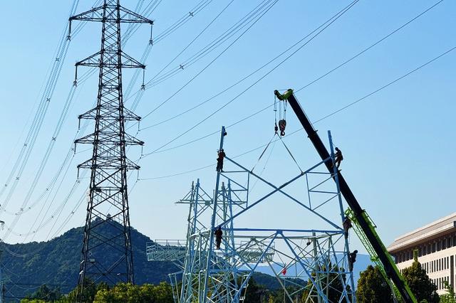 國(guó)網(wǎng)浙江杭州供電公司員工在500千伏嚴(yán)州變電站220千伏送出工程架設(shè)線路。