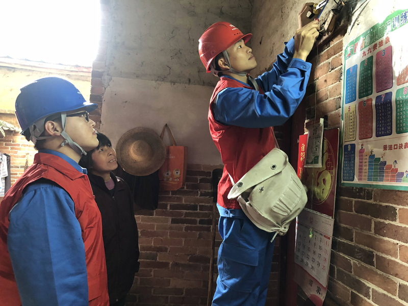 南方電網(wǎng)“高鋒愛(ài)心供電服務(wù)隊(duì)”志愿者為小婷家檢查用電設(shè)備。林丹丹 攝