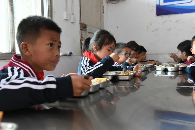 洛麥小學學生用捐贈的餐盤吃飯。龍定錦攝
