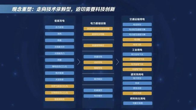 國際能源署(IEA)給出的技術(shù)評估,分別對低碳發(fā)電、電力基礎(chǔ)設(shè)施、交通運輸用電、工業(yè)用電、建筑物用電、燃料轉(zhuǎn)化用電等技術(shù)做了梳理分析,在低碳發(fā)電領(lǐng)域像太陽能光伏發(fā)電等技術(shù)已經(jīng)基本比較成熟,可以走向市場;在電力基礎(chǔ)設(shè)施領(lǐng)域,智能充電等技術(shù)目前還需要進一步研發(fā)、競爭,才能推向市場。IEA2021年的最新報告顯示在全球能源行業(yè)的路線圖里,2050年實現(xiàn)凈零排放的關(guān)鍵技術(shù)中,50%目前尚未成熟,需要進一步研發(fā)提升,可見走向技術(shù)依賴型的經(jīng)濟發(fā)展模式對科技創(chuàng)新的需求更加迫切。