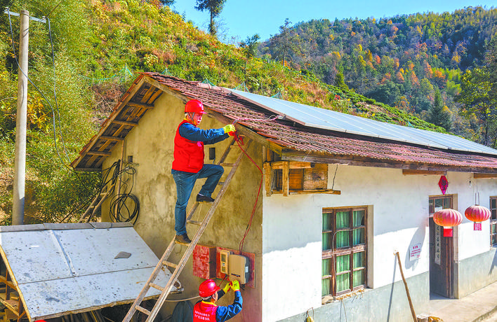 安徽金寨縣供電公司員工檢查用戶屋頂光伏設備運行情況?! 埮?攝