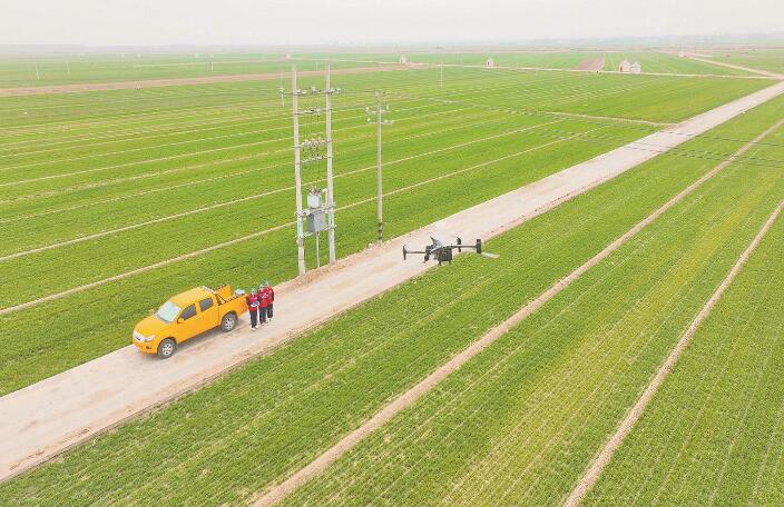 “紅馬甲”網(wǎng)格員操作無(wú)人機(jī)巡檢農(nóng)業(yè)排灌重點(diǎn)線路。