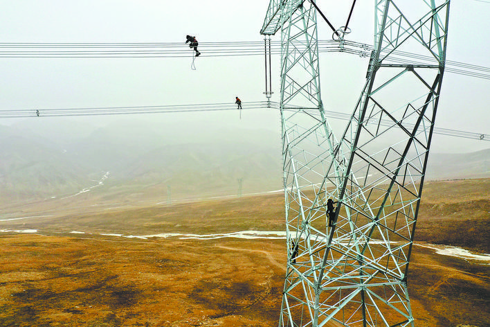 青海省海南藏族自治州,在海拔4000米的拉脊山上,座座鐵塔架起條條銀線。1月24日,在距離地面四五十米的電力線路上,幾個小小的身影迎著寒風健步行走。