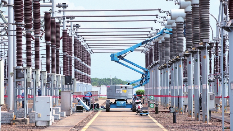 圖為3月23日,在海南澄邁500千伏福山變電站內(nèi),超高壓公司廣州局??诜志謾z修人員通過(guò)高空車開(kāi)展防發(fā)熱專項(xiàng)工作,同時(shí)進(jìn)行斷路器試驗(yàn)。