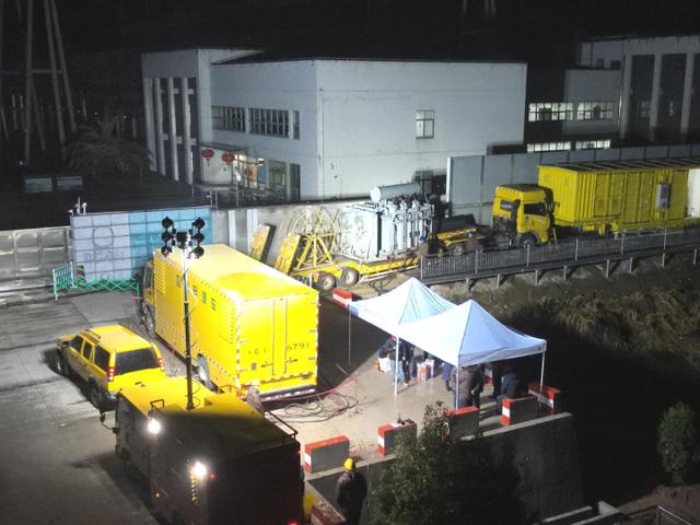 2月23日晚,在紹興新昌220千伏天姥變?nèi)诒F(xiàn)場(chǎng),直流融冰檢修人員正在將融冰電纜接入待融線路間隔。通訊員 高宇男 攝