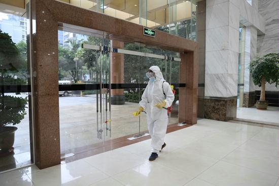 國(guó)網(wǎng)重慶北碚供電公司后勤人員對(duì)辦公大樓進(jìn)行殺菌消毒
