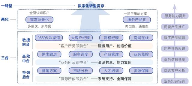 以“三臺(tái)兩化一轉(zhuǎn)型”為抓手,全面推進(jìn)現(xiàn)代供電服務(wù)體系建設(shè),不斷優(yōu)化前、中、后臺(tái)協(xié)同運(yùn)作機(jī)制,暢通企業(yè)內(nèi)循環(huán)。實(shí)體化中臺(tái)建設(shè)穩(wěn)步推進(jìn),“基礎(chǔ)+增值”用電服務(wù)產(chǎn)品不斷豐富,服務(wù)效率不斷提升、用戶獲得感、幸福感和安全感不斷增強(qiáng)。