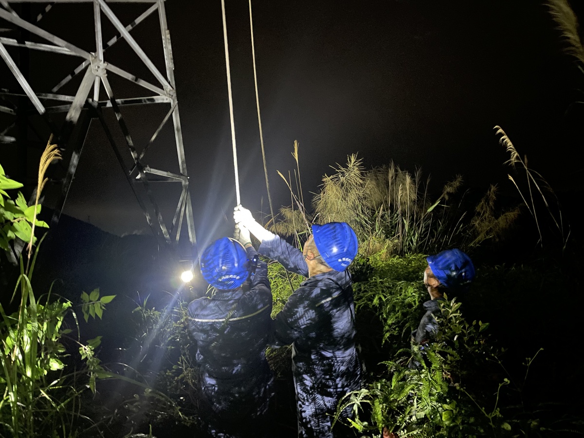 4月20日晚,南方電網(wǎng)廣西新電力集團(tuán)岑溪供電公司搶修人員在山間開展35千伏大歸線20號塔C相絕緣子遭雷擊脫落接地故障搶修工作。通訊員 韋銳 攝