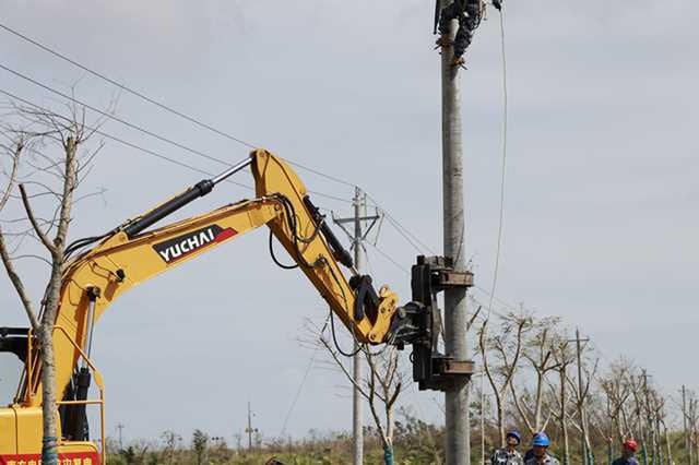 9月16日,在海南省文昌市鋪前鎮(zhèn)七嶺村七嶺2號臺區(qū)搶修復電現(xiàn)場,一臺身著“黃衣”、帶履帶的“龐然大物”,正揮動著靈活的機械臂,伸出它的“鉗子”,穩(wěn)穩(wěn)地抓取12米多長的電桿,一氣呵成把電桿種到桿洞中。當天,只用了3個多小時,它就完成了10基電桿的立桿作業(yè)任務。