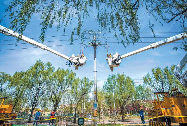 國網(wǎng)北京電力帶電作業(yè)人員在海淀區(qū)西北旺永豐地區(qū)進行配電網(wǎng)帶電綜合檢修作業(yè)。劉小軍 攝