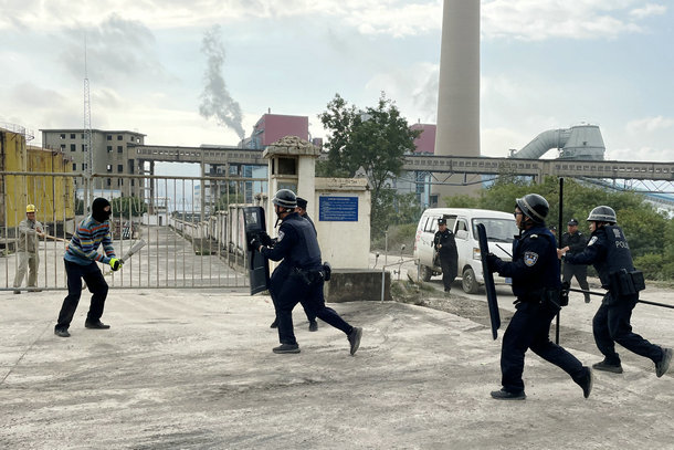 按照演習(xí)方案,兩名“假想嫌疑人”持器械翻越生產(chǎn)區(qū)域3號(hào)門,企圖闖入油泵房破壞生產(chǎn)設(shè)施。生產(chǎn)值班人員發(fā)現(xiàn)歹徒欲行闖入,立即上報(bào),同時(shí)進(jìn)行攔截。該公司應(yīng)急辦迅速啟動(dòng)應(yīng)急預(yù)案,并向公安機(jī)關(guān)報(bào)警,要求出警支援。接到報(bào)警后,鎮(zhèn)派出所快速組織警力趕到事發(fā)現(xiàn)場(chǎng),幾經(jīng)周旋,與公司內(nèi)保人員一起將“恐怖分子”控制抓捕。演練過(guò)程中,該公司各個(gè)部門反映迅速,配合默契,采取處置措施及時(shí)、合理、表現(xiàn)出良好的處理突發(fā)事件的能力。