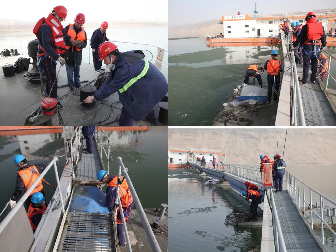 為縮短搶修時間,大家明確分工,多點開花,除冰、接頭檢查、浮橋踏步修正、護欄軟連接鏈條修正、泵船錨鏈調(diào)整等各項工作同步開展。大風(fēng)無情人有情,搶修組選擇就地用餐,后勤組按時按點送來營養(yǎng)豐富的加班餐,大家吃在嘴里,暖在心里。生產(chǎn)副總經(jīng)理組織各項具體搶修工作,制定搶修工作方案,協(xié)調(diào)管線試用,全力確保用水安全可靠。
