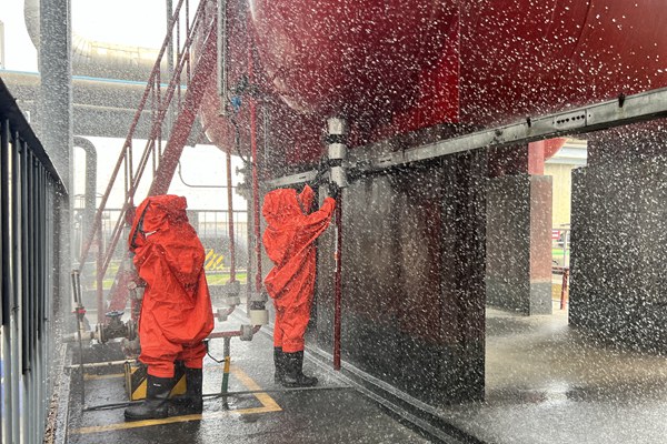 本次演練模擬該公司輔控人員巡檢過程中發(fā)現(xiàn)1號鹽酸罐出口管泄露,有大量的酸霧冒出,并立即匯報當(dāng)班值長,值長確定人員及鹽酸泄漏情況后啟動鹽酸泄漏事故應(yīng)急處置預(yù)案。組織相關(guān)人員立即拉開警戒線,參與演練的員工著防酸服等防護(hù)用品進(jìn)入現(xiàn)場,對鹽酸泄漏點進(jìn)行現(xiàn)場搶修、隔離,消防隊員用消防水槍噴水霧壓制現(xiàn)場酸霧,將含酸廢水引至酸堿廢水池進(jìn)行中和處理。演練過程緊張有序,順利完成。演練結(jié)束后,相關(guān)安全管理負(fù)責(zé)人結(jié)合現(xiàn)場情況,對此次應(yīng)急演練工作進(jìn)行了點評,并與參演人員討論分析了各處置環(huán)節(jié)的不足之處和改進(jìn)建議。